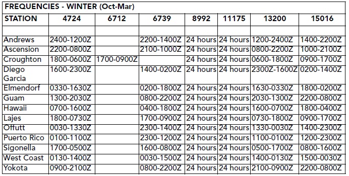 HFGCS stations operate on “core” frequencies to provide increased "Global" coverage. The published frequency listing does not reflect complete system frequency authorizations. These published frequencies will be used for initial contact, EAM broadcasts, and short-term C2 phone patch and message delivery. Other extended or special services will be moved to each station’s available "discrete" frequencies.