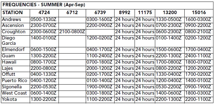 Note: Also the Air Force Eastern Test Range (AFETR) can be contacted as back-up on 10780 (pri) or 20390 (sec) under callsign "Cape Radio". Furthermore a new station has stepped in with callsign "Puerto Rico".
